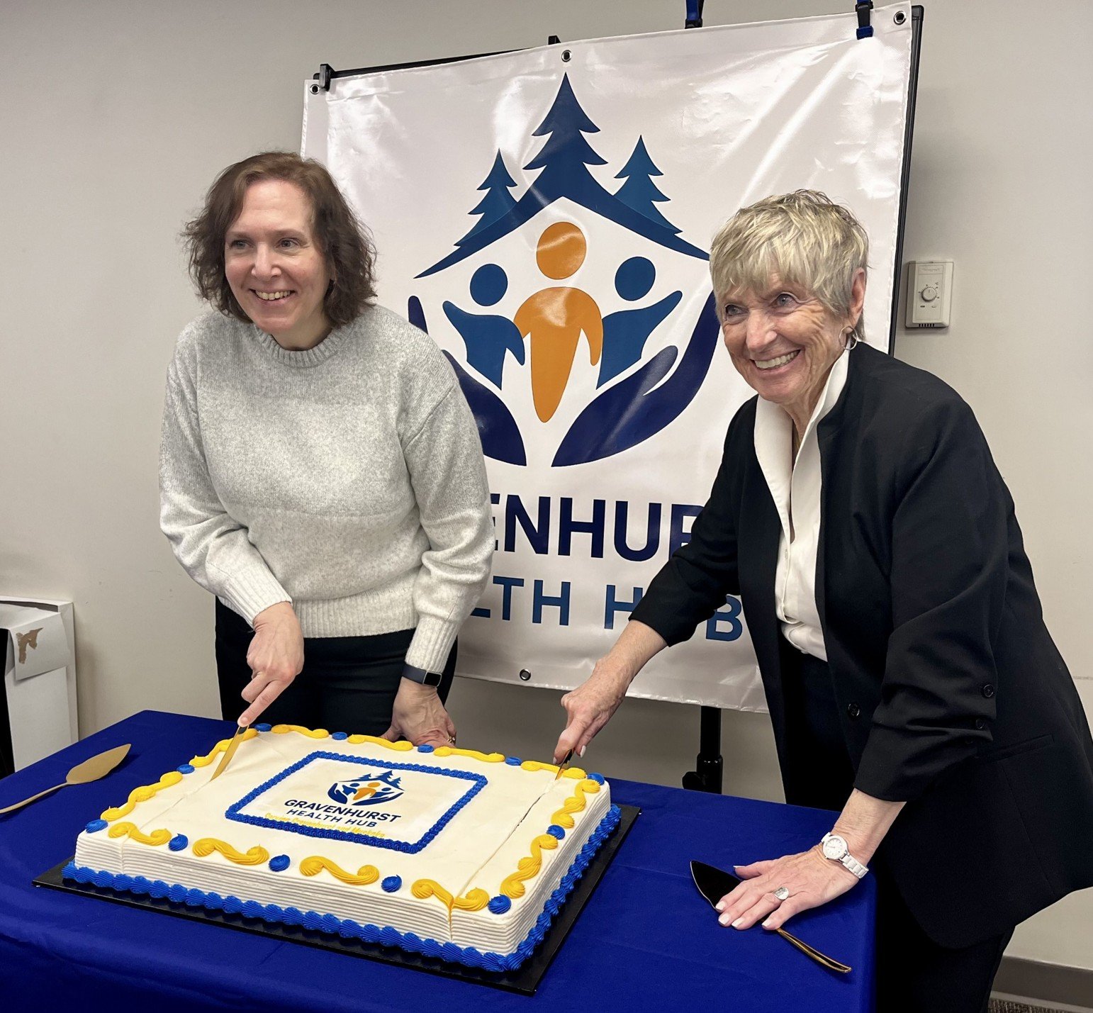 Dr. Tina Kappos CCFHT and Barb McCabe Fundraising Chair cut a cake to celebrate the Gravenhurst Health Hub project milestone.
